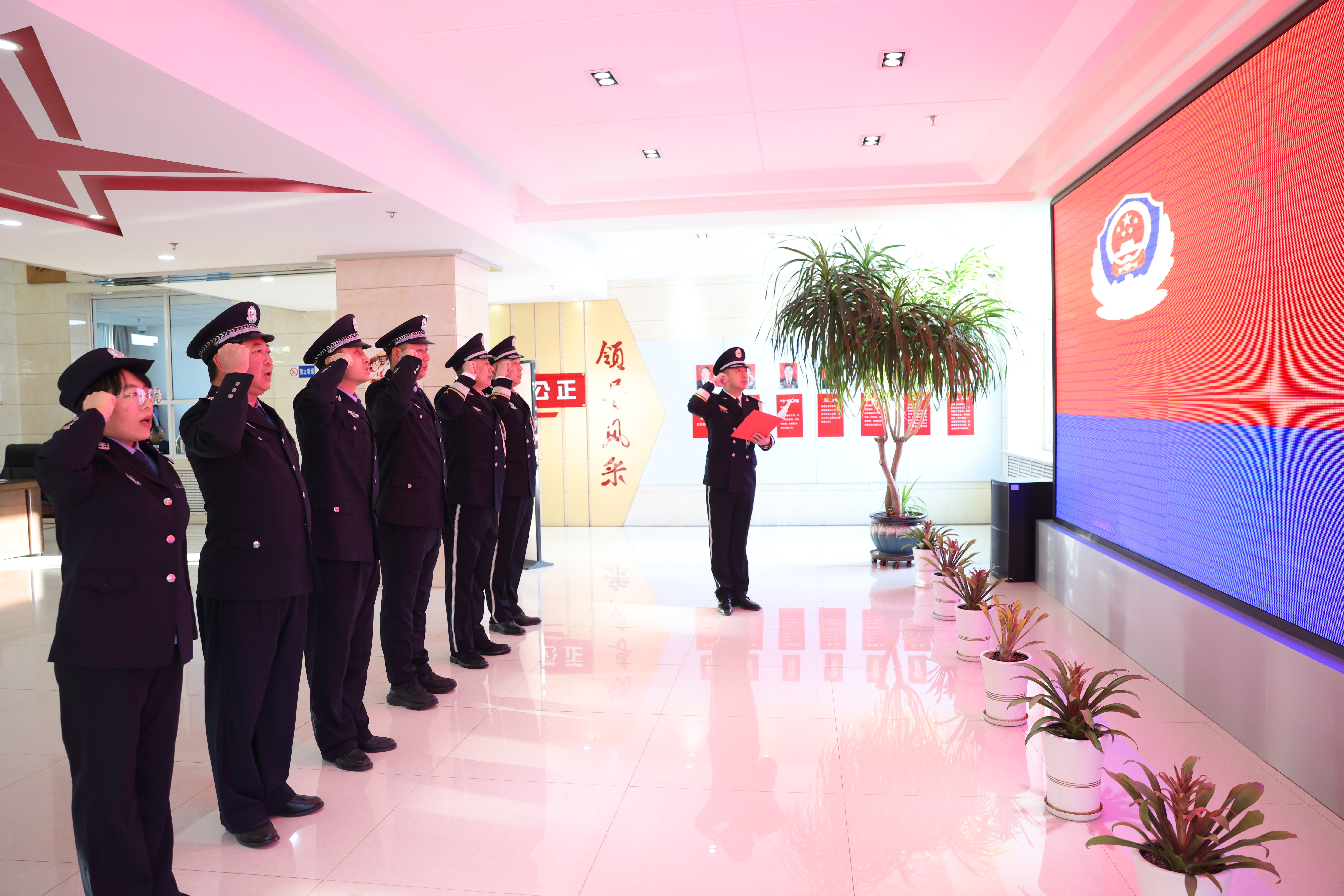 升旗仪式后,全体司法警察面向警旗,重温入警誓词,并围绕警旗合影留念,标准警姿定格珍贵瞬间,一身藏蓝承载责任担当,一面警旗指引方向使命,镜头里满是对司法警察职业的尊敬,更藏着守护司法公正、捍卫法律尊严的决心。
