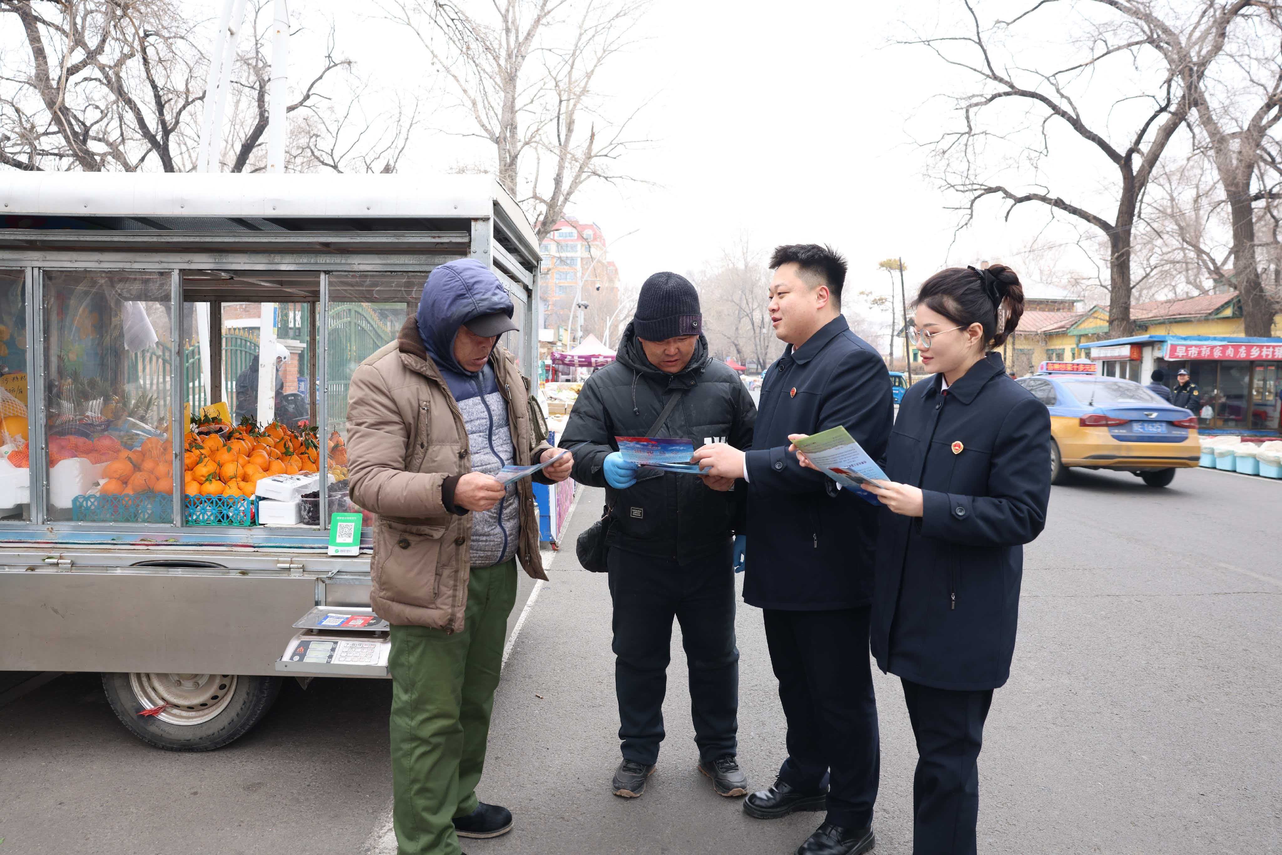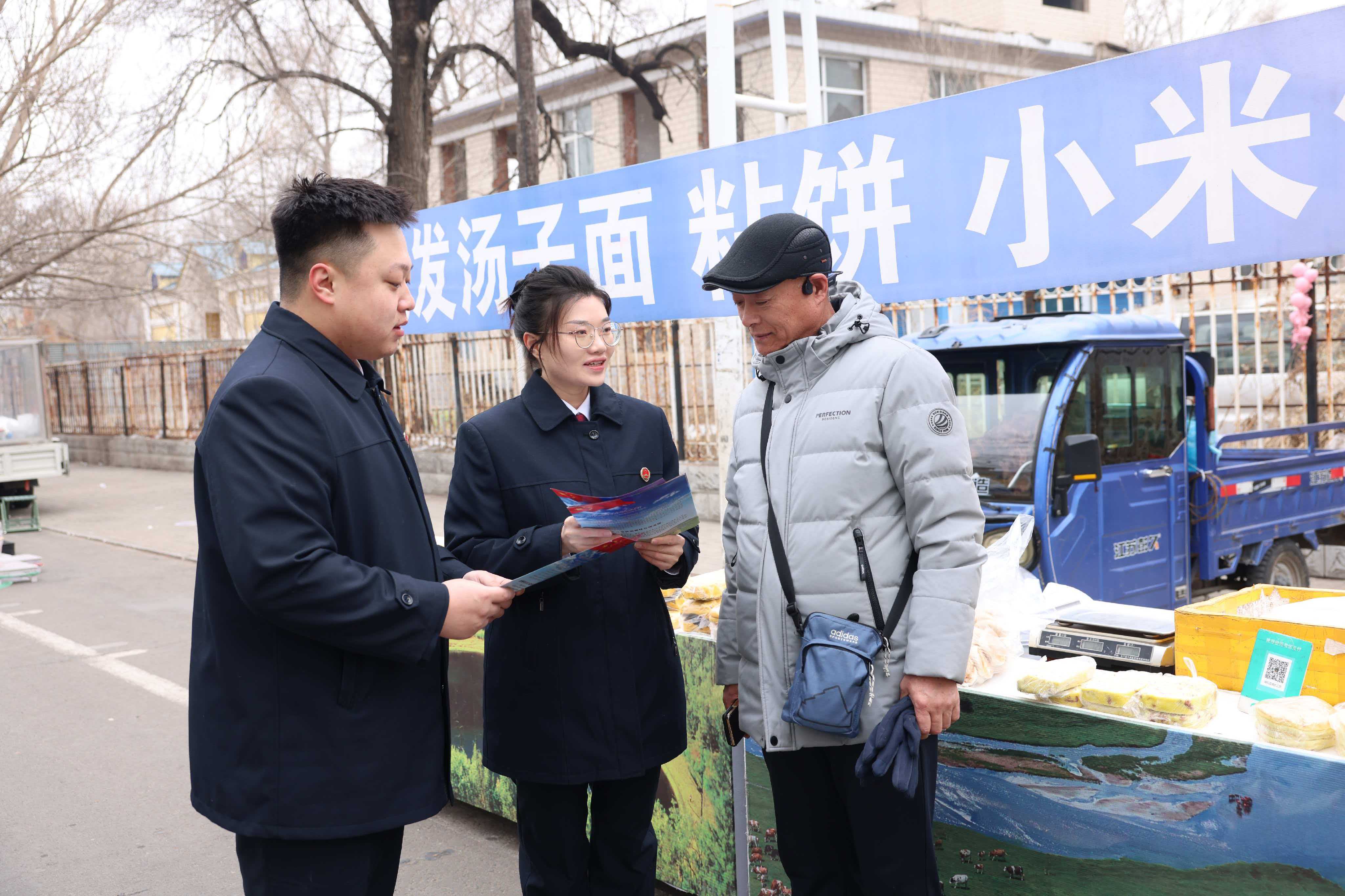 清晨的早市,人头攒动,烟火气正浓。“塞外益检”团队的检察官们穿梭在熙熙攘攘的人群中,将普法宣传单递到过往群众和摊主手中,开展“面对面”的零距离普法。