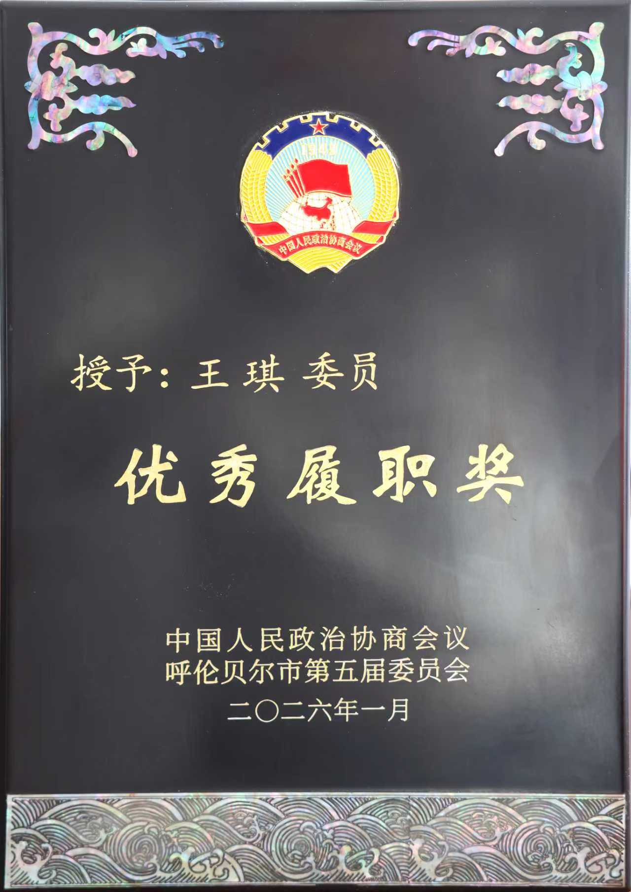 1月23日至25日,中国人民政治协商会议呼伦贝尔市第五届委员会第五次会议隆重召开,会议对2025年度履职表现突出的委员进行了表彰。据悉,市政协五届四次会议以来共有委员315名,其中,扎兰屯市检察院检委员会专职委员王琪同志,凭借在担任政协委员期间的卓越履职表现和扎实工作成效,从参与评选的278名委员中脱颖而出,荣获“呼伦贝尔市政协委员优秀履职奖”!